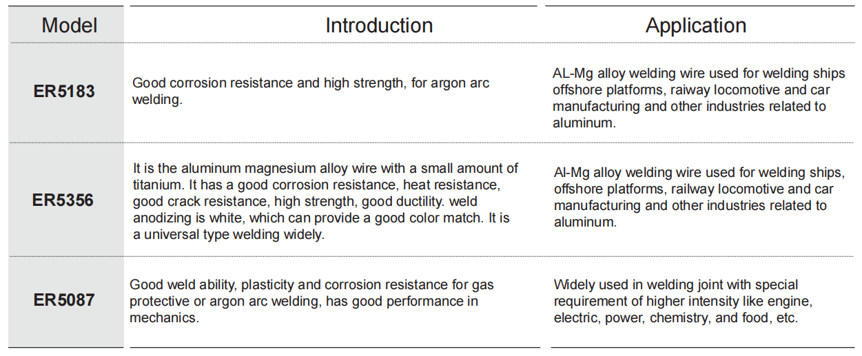 AWS A5.10 ER5087. Good weld ability, plasticity and corrosion resistance for gas protective or argon arc welding, has good performance in mechanics.